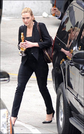 凱特·溫絲萊特對于自己的奧斯卡影后的稱號也是相當(dāng)激動,下面小編給大家?guī)硪唤M圖片,大家可以看到,影后拿著小金人一直不肯撒手,生怕碰壞,可以看得出她是多么重視這個獎項了吧。順便說一下影后的穿著,一身黑色職業(yè)性濃厚,干練的盤發(fā)透出影后的氣勢。