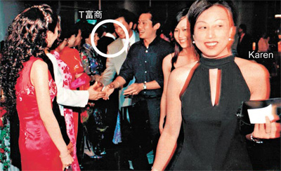 對于Karen早前指T富商與她相好時一直隱瞞有家室,T富商前日展示了兩張02年其正室次子結婚時的照片,原來當時Karen也出席了這個婚宴,而且還與T富商的正室握手。T富商說:“02年我兩個做保險的女性朋友介紹下認識Karen,后來我兒子結婚,我就請她來。所以她怎么會不知我有家室呀?”