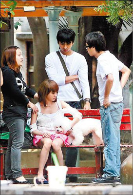 Jolin在片場(chǎng)認(rèn)真演出,她的狗兒子“屋虎”也有專人照顧,坐在木椅上還有人為牠扇風(fēng)解熱,Jolin一有空也不忘關(guān)心狗兒子,坐在木椅上逗弄愛犬。
