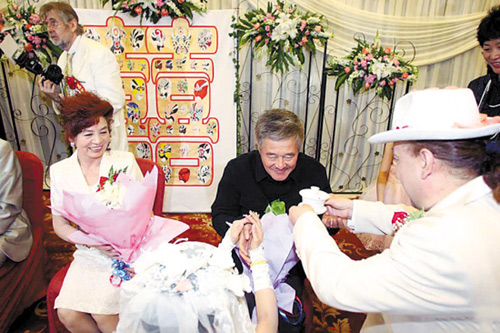 博比·肯接受采訪時,以一口流利的中文對記者表示,趙本山就像他的父親,“讓我倆趕緊把婚禮辦了就是他首先提出來的,今天這個日子也是他定的”。趙本山則透露了這對新人從相識、相知到相戀的經過:“1999年,小伙子(博比·肯)去香港演出,婷婷(張雯婷)當時是跳舞的,也不知道他倆怎么就認識了,還整出來一個什么‘二人組合’!辈┍取た献非笏囆g的那股勁頭感染了張雯婷,她愛上了這個“一根筋”的同行老外,“后來呢,婷婷去北京電影學院學導演,畢業后兩人又長年在外頭演出和拍戲,婚事就這么著給耽擱了”。直到今年他們相戀10年之際,博比·肯才得以正式迎娶張雯婷。對這位愛徒,趙本山贊賞有加:“小伙子挺機靈,進步很快。我2002年教他二人轉,現在他登臺表演,你已經感覺不出來他是老外了。”博比·肯還曾在《劉老根》等趙本山的多部電視劇中出演角色,而張雯婷還擔任了《劉老根2》的執行導演。本報記者 晨曉 文/圖