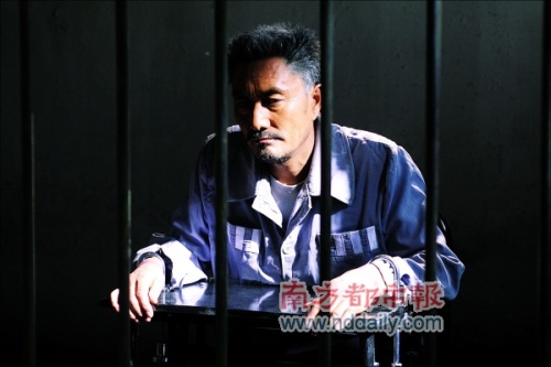 當(dāng)日的內(nèi)景拍攝現(xiàn)場是一間不足20平方米的小屋,整間小屋被布置成監(jiān)獄會見室的樣子。一道監(jiān)獄的鐵閘將小屋一分為二,鐵閘外是一張小桌,上面放著一杯沖好的茶水和一沓文件,這是律師徐崢會見犯人時所用的桌子。鐵閘里只放著一張輪椅,穿著囚服的多布杰就坐在這張輪椅上與徐崢談話。多布杰的左腿整個小腿部分由支架支撐,據(jù)說,這是一條已經(jīng)被鋸過的假腿。整個囚室都籠罩在一片發(fā)藍的光線里,微塵在光里飛舞,有冷感。