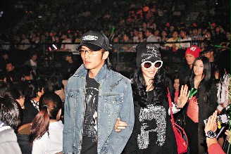 據(jù)臺灣聯(lián)合報報道,張柏芝與謝霆鋒抱著兒子姍姍來遲,陳奕迅演唱會開場時才現(xiàn)身,張柏芝穿著一身黑色寬松衣服,頭戴黑色骷髏骨頭布巾及大墨鏡,手上拎著大紅LV包包,手挽著謝霆鋒走到VIP區(qū),短短路程成為焦點,心情愉悅的柏芝,不斷與觀眾揮手致意,柏芝中途離場,經(jīng)紀人強調(diào)她沒懷孕,只是腸胃炎不舒服。