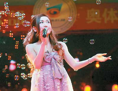 溫碧霞洗浴中心獻唱 抹胸長裙下滑險走光(圖)