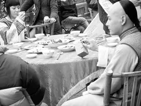 “這是我們的主菜掌上明珠。”趁著拍戲的空檔,演“金寶”的英俊小生邱心志當(dāng)起了“跑堂”,給記者介紹起菜來。戲中的明爭(zhēng)暗斗都在餐桌旁,于是,這桌菜成了重要的道具。記者發(fā)現(xiàn),這些菜還是實(shí)打?qū)嵉恼娌恕T谶@桌菜邊上一坐幾個(gè)小時(shí),還不能動(dòng)筷子,無聊時(shí),邱心志就把戲里的另一個(gè)道具——裝印章的盒子放在桌子上來回玩耍,像個(gè)雜技演員。