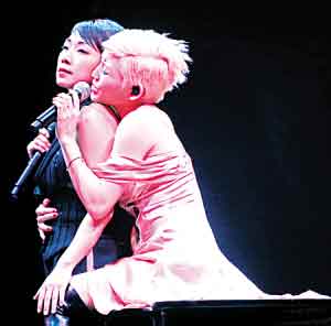 劉美君一連兩場“大開色界演唱會”于前晚結束,繼首場跳辣舞玩盡男嘉賓后,尾場換了口味,與嘉賓林憶蓮玩“斷背相親”,掃胸、摸背、擁抱樣樣齊全,不過另一嘉賓蘇永康不但無艷福享,還大爆劉美君當年是眾男的幻想對象。