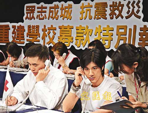 中新網(wǎng)5月19日電 據(jù)香港《文匯報》報道,臺灣藝人舉辦籌款賑災晚會 “眾志成城抗震救災,重建學校募款特別報道”節(jié)目,于前晚播出。歷經(jīng)4個小時的募款,共募得3千9百多萬元。適逢當晚是王力宏32歲生日,對有份到場演出的Leehom來說特別有意義。