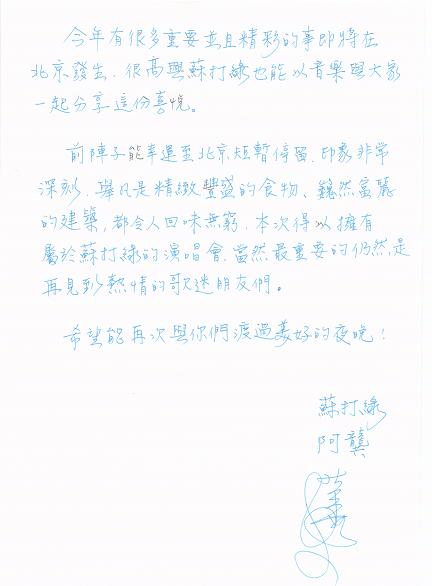 中新網6月10日電 隨著6月15日“陪我唱歌”蘇打綠北京演唱會的日益臨近,全國的歌迷翹首以待臺灣第一樂團蘇打綠的到來,演唱會的門票的銷售情況也是非常的火爆。近日,遠在臺灣的蘇打綠樂團,親自手寫信函來表達對歌迷此次演唱會的支持與厚愛,同時也表達對此次北京之行的急切與喜悅之情。