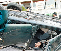 中新網(wǎng)7月6日電 謝霆鋒5日拍攝林超賢導演新片《證人》時,除了一場撞車戲外,還要在翻轉了的車廂內倒掛拍攝。賣命演出的他,不但沒有叫苦,更笑言這套戲已算小兒科。至于公司會否開戲給他與鐘欣桐合作,霆鋒稱未落實的事他不會聽。