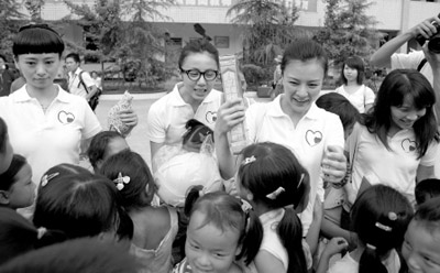 這支明星隊伍很特別:除了劉孜以外,其余都是年輕媽媽,因此特別要求探望災區(qū)的小朋友們。一行人早上8點半從成都出發(fā),接近中午時才抵達梓潼的兒童福利院。孫莉和黃磊的女兒多多已經(jīng)快2歲半了,看到這些天真無邪的孩子,孫莉特別心疼,一個勁兒地往他們手里塞各種小禮物。而很久沒出來唱歌的陳明,還自己掏錢給孩子們買了好多彩色橡皮泥。在永安小學陳明借來一個擴音喇叭,汗流浹背地唱起那首《快樂老家》。今天,愛心媽媽們還將前往德陽的兒童福利院繼續(xù)她們的“獻愛行動”。(記者 喬雪陽 攝影 楊剛)