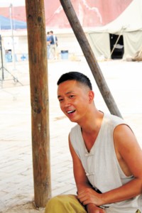 穿了馬褂、全身都已涂得黝黑,昨天出現在橫店片場的潘粵明儼然一副40年代軍人的打扮。他在影片中扮演了舞美隊長,是一個性格純樸、待人耿直的人,來不及卸妝的潘粵鳴接受記者采訪時也是有問必答,照實全說。