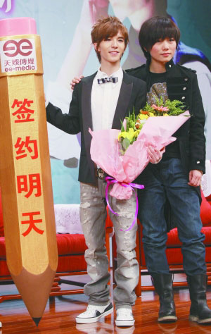昨天的簽約儀式上,天娛當家花旦許飛(右)獻花歡迎“師弟”郭敬明。