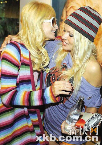 她身穿藍(lán)色T恤,香肩半露,下身僅穿三角褲,站在裸體艷女畫(huà)像前大擺pose,席間與“豪門(mén)欲女”帕麗斯·希爾頓親密相擁打招呼。
