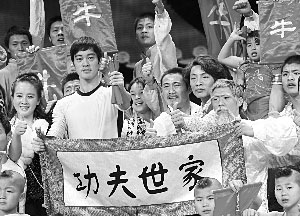 一部《李小龍傳奇》讓陳國坤成為2008年人氣最旺的演員之一,由他參演的滑稽舞蹈《功夫世家》也是昨天彩排中人氣最高的節目,雖然以李小龍裝扮出現的陳國坤表演“雙截棍”的時候,觀眾席上前排一位一直在玩游戲機的小男孩也看得拍起手來。《功夫世家》的風格相當搞笑,演員們有的穿著睡衣,拿著飯鍋、菜板等道具,在一起“比武”。節目里面的人物很多“借鑒”自周星馳的電影作品,造型怪異,但卻個個功夫高強,甚至《功夫》里的戴著“燙發卷”的“包租婆”也出場“搞笑”了。陳國坤在《功夫世家》中最后亮相,他除了表演雙截棍外,還要用拳和腿分別擊開兩塊木板。雖然是以舞蹈節目的形式出現,《功夫世家》在現場贏得的笑聲并不比演員類節目少。