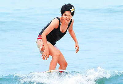 她痛得頭昏眼花,但忍痛繼續挑戰,結果又翻落海中,浪板竟砸在她的左眼眼窩處,她昨形容:“因為太痛,當下都忘記頭跟腰的痛。”她痛得受不了,決定走回岸邊,不料又一腳踩上尖銳的石頭及海膽的刺,當場割傷、流血,友人忙幫她搽藥、包扎。