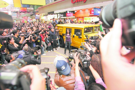 當天的活動從下午4點開始,但從2點左右這家店門口便開始陸續圍起了人群,全港傳媒也是齊齊出動。當阿嬌出現時,由于道路狹窄,工作人員幾乎是拖著阿嬌擠進店里的。記者看到,期間不少阿嬌的粉絲都敲鑼打鼓為其鼓氣,有人還高呼,“阿嬌我愛你”“阿嬌,把你電話號碼告訴我”,持續十分鐘的尖叫也讓阿嬌不免尷尬一笑。此后阿嬌在該品牌店逗留了近一個鐘頭,代理店長并為粉絲搭配服飾,頗有心得體會。盡管面對媒體已經不是第一次了,但看得出英皇方面對于阿嬌復出還是做了充足的準備,藝人總監霍汶希不但全程兼任“保鏢”工作,當阿嬌近距離接受媒體采訪時候她更是寸步不離……