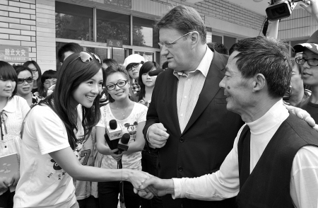 在探望中,一位大爺來(lái)到章子怡身邊。院長(zhǎng)吳德玉向章子怡介紹,這是福利院的門衛(wèi)大爺。在去年5·12地震發(fā)生時(shí),為了救被困在院里的孩子,大爺不顧危險(xiǎn)翻墻進(jìn)去,不慎摔傷了自己的雙腿。章子怡很感動(dòng),她突然伸出右手高呼:“向抗震英雄學(xué)習(xí)!”并佩服地對(duì)大爺說(shuō):“你是英雄,你是超人!”