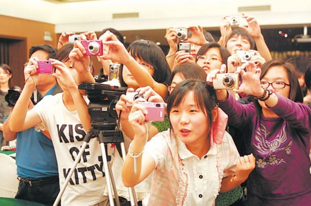一分鐘內(nèi),包裹著劉謙的人群,像只巨大的毛線團(tuán),逐漸消失在宴會(huì)廳側(cè)門。主席臺(tái)上,幾位“粉絲”有幸搶到了劉謙桌上的涂鴉紙,上書“山外青山樓外樓”,再問發(fā)布會(huì)的內(nèi)容,他們?cè)缫雅d奮地答非所問:“他收了我們送的粽子。”