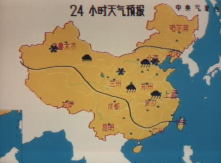《天氣預(yù)報》節(jié)目開播最初,每天的文稿都是由氣象臺負(fù)責(zé)撰寫,然后傳真給電視臺;所用的圖就一張24小時預(yù)報圖,它是整個節(jié)目的“當(dāng)家花旦”,播報員就是圍繞著它說話的。那時候沒有什么技術(shù)含金量,每天都用手繪完成(鉛筆畫好之后再用鴨嘴筆描粗),畫好后中央臺派車來取。