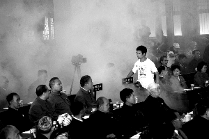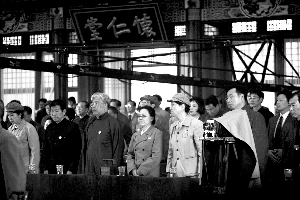 11時許,委員們攜手走進了基地內仿制的“中南海懷仁堂”,這里的道具都是模仿當年的真實場景設置,包括桌上的水杯、文件封面。邁進“會場”,大家表情嚴肅了許多,已連續(xù)3屆當選政協(xié)委員的徐定茂回憶,自己第一次走進人民大會堂履職時,心情也非常激動,“第一屆會議具有特殊意義,可想當年委員們的心情。”在導演的指揮下,委員們落座,投入“默哀”、“選舉”等場景的拍攝中。記者傅沙沙