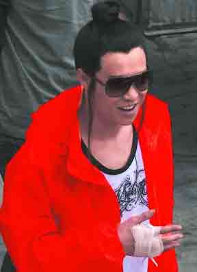 小沈陽穿著一件鮮亮的橙色外套,里面是一件隨意的白色T恤,臉上已經化好妝,戴著墨鏡,而不是大家常見的黑框眼鏡,乍一看還真有點認不出來。小沈陽的古裝頭套已經戴好,只是一個簡單朝上梳的發髻,不過鬢角兩側還特地留了兩縷長長的頭發。記者一眼就發現,小沈陽的右手不自然地舉在小腹前,還用白色的紗布進行了包扎,肯定是受傷了。不過小沈陽的心情看上去好極了,他先是哼歌,后來見記者追問拍戲感受,他便取下墨鏡,反問記者是哪里人,不過面對“第一次和張導拍戲的感覺怎么樣”的問題,小沈陽只是微笑,并不回答。