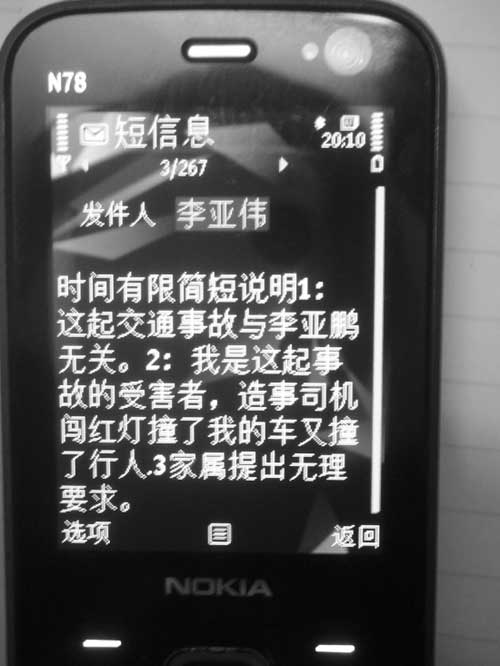 昨天,李亞偉接受了本報記者的采訪,針對“車禍門”事件,他給記者發(fā)來短信表明態(tài)度——1:這起交通事故與李亞鵬無關(guān)。2:我是這起事故的受害者,造事(應(yīng)為肇事)司機闖紅燈撞了我的車又撞了行人。3:家屬提出無理要求。