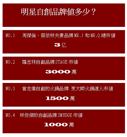 而針對這種明星以自己名義創(chuàng)立品牌的現(xiàn)象,究竟明星們的品牌價值值多少?為此記者特意采訪了知名品牌管理學(xué)者的楊教授,據(jù)楊教授解釋:由于藝人本身具有較高的社會知名度和形象的度,因此藝人創(chuàng)意品牌的價值起點都會比普通人高出好幾倍,因此藝人的知名度和形象度與其創(chuàng)立的品牌價值是密切相關(guān),從某種意義上成正比關(guān)系,而對娛樂圈的一些藝人及其自創(chuàng)品牌,楊教授也給出一個系統(tǒng)的市值評估,如羅志祥的自創(chuàng)品牌STAGE市值 3000萬,林俊杰的自創(chuàng)品牌SMUDGE市值1000萬,曾志偉自創(chuàng)的火鍋品牌烹大師火鍋達人市值1500萬,而周杰倫與蔡依林這次合伙經(jīng)營的MR.J和MR.Q市值,楊教授也給出了一個值得參考的數(shù)據(jù)3億。