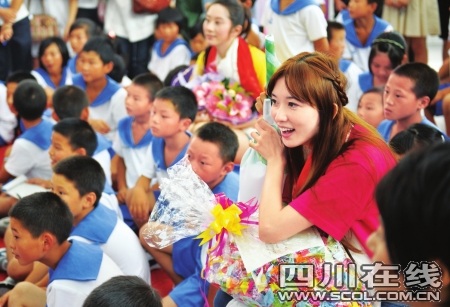 昨日上午,林志玲領銜,曾寶儀、光良、江美琪、許慧欣、謝娜、譚維維、胡彥斌、弦子、楊紫等走進了嶄新的“安康家園”棠湖小學,這里生活著幾百名因地震受創的孩子。而在校區食堂,一個簡單隆重的“愛在傳遞”安康家園兒童心系臺灣小朋友活動正在舉行,60余位小朋友看著電視上的大明星來到了他們身邊,都非常興奮,還獻上了潔白的哈達。