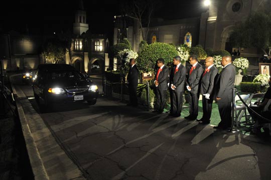 扶靈者是邁克爾的幾位哥哥。他們?nèi)即┲豢钍降暮谏餮b,以及只戴一只白手套,向他們心愛的弟弟道別。