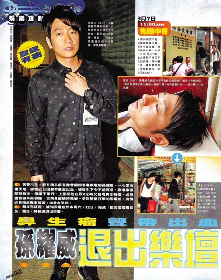 原本10月出唱片的孫耀威,上月忽然向所屬的環球唱片公司以聲帶不適為由,要求無限期押后錄音,并推掉一連串登臺工作。據知半年前,孫耀威發現每次表演后喉嚨便出現劇痛和紅腫,起初他以為是一般歌手常有的聲帶發炎,于是便戒酒救聲,但一直沒有好轉,最近才被醫生證實是聲帶出血,每次唱歌都會引發聲帶微血管爆裂,喉嚨充血。聲帶出血將孫耀威的事業計劃全盤打亂,他原本計劃明年在臺灣出碟,如今都因病泡湯。