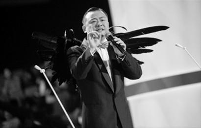 當(dāng)晚,周立波一身筆挺修身的黑西裝在舞臺(tái)上亮相,只不過(guò)背后“長(zhǎng)”出了一雙黑色的羽毛翅膀,最搞笑的是,他居然提了個(gè)小板凳,然后直挺挺地站了上去,因?yàn)樗車(chē)拿琅畟(gè)頭都比他高。“我今天的造型其實(shí)是個(gè)天使,但很多人說(shuō)我像只烏鴉,但你們別把烏鴉不當(dāng)鳥(niǎo),別把饅頭不當(dāng)點(diǎn)心!”
