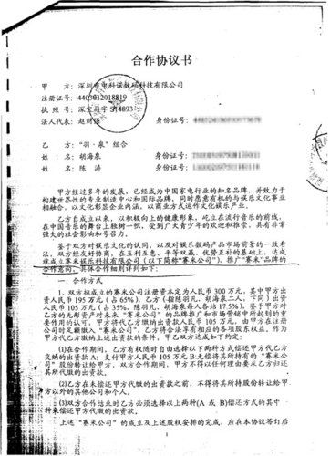 記者從李靜傳律師處了解到,2005年“羽·泉”與該公司達成協議,雙方擬成立賽米娛樂科技有限公司,注冊資本為人民幣300萬元,經營項目為MP3、DVD兩種,由公司出資195萬元,即持有65%的股份,“羽·泉”為產品形象代言人,并持有35%股份,不過鑒于該公司對“羽·泉”的名人效應對未來“賽米公司”的品牌推廣和市場營銷起到的重要作用的認可,該公司將代“羽·泉”繳納出資款105萬元。