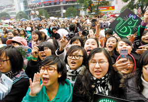 本報訊 山城昨日陰雨綿綿,不過這絲毫沒有影響到周筆暢的人氣。從中午開始,觀音橋茂業(yè)百貨外的簽售現(xiàn)場就聚攏起了四面八方趕來的筆迷。現(xiàn)場足有近二千人,超過上一次古天樂在同一地點簽售時的狀況。