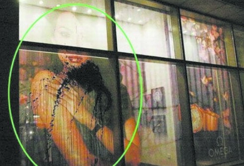 張曼玉沒來,章子怡也只是外出吃飯。正當記者們準備收工時,又一件意外的事情發(fā)生了。23點,一輛黑色奧迪Q 7在酒店門口停了下來,隨后四五個身穿迷彩服、戴著墨鏡的男子從車里走下來進入酒店大堂詢問保安:“章子怡住幾層?”看到保安未予理會,這幾個人立刻站在酒店大堂內(nèi),用東北話高喊:“大傻X!騙人錢!勾引人老公!”而大約半小時后,這輛車又回到了酒店門前。這次車上下來兩個身穿套頭衫的男子,手里拿著墨汁,走到酒店東側一間章子怡代言的鉑金店門前,沖櫥窗里的章子怡海報將墨汁潑了上去(見上圖)。隨后,兩人上車,Q 7拉著警報揚長而去。