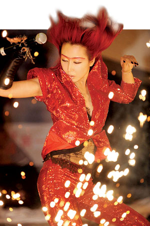 火紅的頭發、紅色亮片裝以及酷似LadyGaga(以勁爆造型聞名的美國流行音樂新晉 “舞后”)造型的激光太空鏡……歌手孫悅昨日在京發行新專輯 《變》,造型大變身。