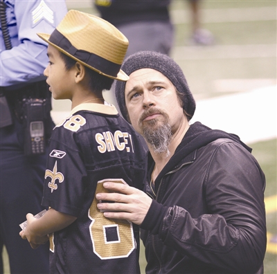 美國當地時間1月16日,布拉德·皮特帶著養子馬多克斯和導演斯派克·李現身美式橄欖球賽場,在比賽間隙,皮特利用明星身份帶著兒子與偶像隊員來了個親密接觸,滿足了球迷兒子的小心愿。