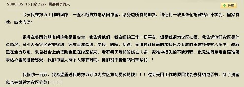 在2008年地震發(fā)生后,北京的同事接到子怡捐100萬的指示后,他們分別給紅十字會捐了兩筆錢。我們當(dāng)時都不在國內(nèi),我也沒盯這事。但在最近兩個星期看到媒體報道說捐款總數(shù)沒有達到100萬,我便開始調(diào)查此事。當(dāng)我尋找捐款收據(jù)時,才發(fā)現(xiàn)一直沒有。今天紅十字會告訴我,捐款的收據(jù)一直在紅十字會那邊,因為他們沒有寄出收據(jù)的地址。當(dāng)我了解到收據(jù)細(xì)節(jié)時,才確認(rèn)了善款只有84萬元。同時再了解到當(dāng)時會計和另一個同事她們在各自匯出金額上出現(xiàn)了紕漏,都以為對方匯出了差額。