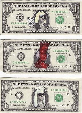 據悉,此次將喬治·華盛頓的1美元鈔票換成lady gaga肖像的行為,是美國一畫家克里斯·格里森(Chris Gleason)杰作。他將1美元鈔票里,原來喬治·華盛頓的頭像,直接修改成了lady gaga經典造型,并分出多個版本。此外,畫家克里斯·格里森還將這12張為一組“偽造”的lady gaga1美元鈔票,放到網上出售,售價為15美元。