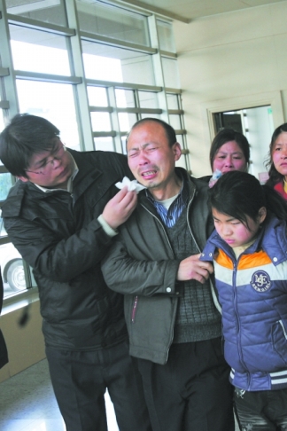 自從醫(yī)院方面向王成記透露李榮珍的病情繼續(xù)惡化后,一向很堅(jiān)強(qiáng)的王成記仿佛老了10歲。雖然昨日換了一身干凈衣服,可是王成記兩眼無光,還沒走近重癥監(jiān)護(hù)室已哭得死去活來。因?yàn)橹匕Y監(jiān)護(hù)室每次只能進(jìn)兩個(gè)人,所以王成記的女兒、兒子以及親朋好友進(jìn)去后,王成記才一個(gè)人走了進(jìn)去。剛走到妻子的病床前,這個(gè)男人一下跪了下去,握緊著李榮珍的右手,淚流滿面。“你快點(diǎn)醒來,兩個(gè)娃娃還等著你,你不要睡了……”王成記的哭聲,讓現(xiàn)場的每個(gè)人都感到很難過。盡管媒體昨天報(bào)道李榮珍已經(jīng)腦死亡,但王成記表示醫(yī)院并沒有向他出示腦死亡的證明,雖然他也表示妻子生存的幾率很小。王成記與家人商量后,表示將繼續(xù)醫(yī)治妻子,希望能夠出現(xiàn)奇跡。