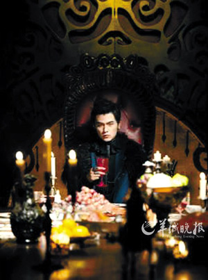 在新專輯預售海報上,周杰倫以一個中古世紀的吸血鬼扮相出現。只見他臉色蒼白,嘴唇鮮紅,穿一身西裝外套,還罩了一件羽毛披肩,坐在餐桌前若有所思,像是一個住在城堡中的神秘“吸血鬼王子”。造型師還在周杰倫的指甲貼上帶有鉚釘的指甲片,讓握著酒杯的手流露出華麗感;眼睛里則戴上了特殊的隱形眼鏡,營造出一雙“電眼”,眼里還有動物般的直立橢圓瞳孔,詭異得令人戰栗。
