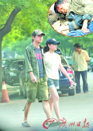 當日下午,北京天氣比較炎熱,潘粵明頭上戴一頂帽子,與董潔十指相扣出現在記者的視線中。也許是身體還未完全恢復,潘粵明在T恤外套了一件深綠色長袖襯衣。董潔身穿一件米黃色短袖小衫,配一條牛仔短褲,顯得十分清涼。