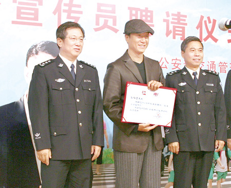 在熱播電視劇《潛伏》中成功扮演地下黨員余則成的影視明星孫紅雷,今日又多了一個(gè)身份———交通安全宣傳員。今天上午11點(diǎn)半,孫紅雷在眾多媒體“咔咔”作響的鎂光燈下,從公安部交通管理局局長(zhǎng)楊鈞手里接過(guò)大紅的“交通安全宣傳員”證書,正式成為公安部交通管理局聘請(qǐng)的首位交通安全公益宣傳明星。