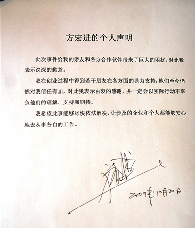 方宏進的聲明字數并不多,全文為打印字體,在文末空白處,方宏進簽上了自己的名字。一開頭,方宏進就道歉,“此次事件給我的親友和各方合作伙伴帶來了巨大的困擾,對此我表示深深的歉意。”飽受爭議的方宏進直言:“希望此事能夠盡快依法解決,讓涉及的企業和個人都能夠安心地從事各自的工作!