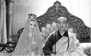 昨日拍攝的主要是唐僧在女兒國的戲份。女兒國國王舒暢身著紅色盛裝手牽唐僧聶遠登上皇宮寶座,然后兩人并肩坐下,氣氛顯得有些曖昧……