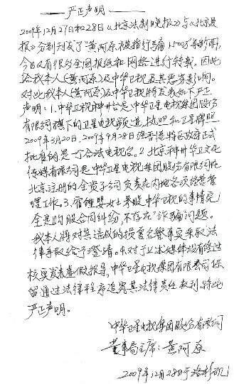 4,對于有關媒體沒有經過核實發表“虛假報道”,中華衛星電視集團有限公司保留通過法律程序追究其法律責任的權利。