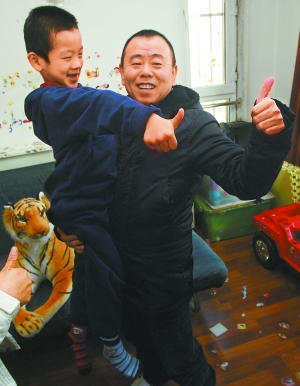 昨天上午,在本報記者和信報記者的陪同下,抱著一只玩具老虎的潘長江來到了位于南四環(huán)的韜寶家中。潘長江的到來讓韜寶的父母格外欣喜感動,但以往只在電視里見過潘長江的小韜寶起初有些“認生”。不過,當他一眼看見潘長江手中的CD時,立刻興奮得一躍而起,拿過CD就急著要播放。尤其當他聽到《過河》的旋律時,更是興奮地滿地打滾,并模仿起潘長江在《過河》中的表演。