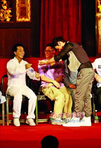 甄子丹當日以一身白色功夫裝亮相,在隨后的發布會,眾多媒體見證了他一次收下黃曉明、釋小龍和蔣岱言三位徒弟。“海選”出來的“小李小龍”蔣岱言現場耍雙截棍,還虎虎生威地打了一套拳。之后,黃曉明等三人一起向甄子丹敬茶致禮,場面十分溫馨。黃曉明說自己今后將多拍“打戲”,但有記者問:“你怎么一把年紀了才來學武術?”黃曉明笑言:“活到老學到老啦。男人應該都會點功夫,有強壯的體魄,才能保護女人!”