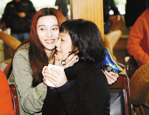 本報成都專電 由女導演李玉執導,范冰冰、陳柏霖、張艾嘉主演的電影《觀音山》正在成都熱拍,昨日,劇組在位于成都龍泉驛的拍攝地接受媒體探班,首次合作的內地美女范冰冰和臺灣才女張艾嘉親密無間,在有記者稱她們兩個有點“不搭”時,范冰冰還特意走上前來,給張艾嘉一個親吻。
