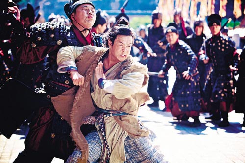 如果說被鋼絲吊在半空“飛”難不倒小沈陽,那么接下來的打戲則是難度不小,因為小沈陽聲稱不必用替身,而程小東又是有名的較真導演,對動作細節(jié)的要求之苛刻達到“令人發(fā)指”的程度,因此小沈陽接受了更大的挑戰(zhàn)。這段時間橫店悶熱難耐,有一場小沈陽殺進皇宮英雄救美的戲,對手演員是片中大反派——第一高手徐少強。這種天氣穿著厚厚的古裝拍戲,即便站著不動都會汗流浹背,何況還是拍動作戲,當小沈陽在程導的指揮下一遍遍拳打腳踢、跳躍騰挪后,早已是揮汗如雨,幾乎每拍一個鏡頭都要換下一身汗?jié)竦膽蚍?/p>