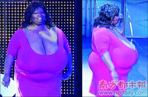 意大利一檔電視節目日前舉行了“全球最大胸圍女人”的比賽。美國30歲的女子諾瑪·斯蒂斯,以67英寸的傲人胸圍,連續10年勇奪“世界最大天然胸部”這一頭銜,她的一對乳房重量高達18公斤,創下吉尼斯紀錄。