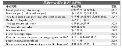 新浪讀書日前在網上發起 “票選十大爆笑英語”活動,截止到今晨共有7250位網友積極參與,選出最火也最有趣的十大中式英語。